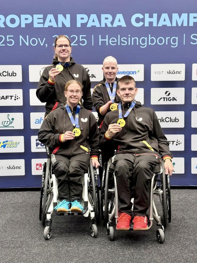 Goldener Sonntag in Helsingborg: Bei den Para Tischtennis-Europameisterschaften (20.–25. November) feierte das deutsche Nationalteam einen historischen Erfolg: Vier Goldmedaillen in den Einzelwettbewerben! Paralympics-Siegerin Sandra Mikolaschek krönte sich erstmals zur Europameisterin (WK4-5), Thomas Schmidberger (WK3) verteidigte souverän seinen Titel von 2023. In den stehenden Klassen jubelten Juliane Wolf (WK8) und Stephanie Grebe (WK6) über ihre ersten Einzel-Goldmedaillen. Alle vier sicherten sich damit das Ticket für die WM 2026 in Thailand.